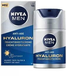 Krem NIVEA MEN Anti-Age Hyaluron SPF 15 50 ml jest przeznaczony dla mężczyzn i posiada pojemność 50 ml. W jego składzie kluczowym składnikiem aktywnym jest kwas hialuronowy, który stymuluje procesy odnowy komórek skóry, co wspomaga redukcję zmarszczek oraz poprawę jędrności skóry. Krem zawiera także filtry UVA/UVB zapewniające ochronę przeciwsłoneczną – wartość SPF 15. Formuła została opracowana specjalnie z myślą o męskiej skórze z oznakami starzenia, a producent podkreśla, że jest to produkt bez mikroplastiku, zgodny z definicją UNEP.