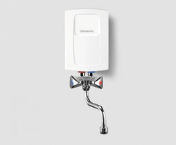 Kospel EPS2-5,5 Twister to przepływowy, elektryczny podgrzewacz wody przeznaczony do pracy bezciśnieniowej (tj. bez magazynującego zasobnika). Urządzenie ma moc znamionową 5,5 kW / 230 V. Regulowany przełącznikiem mocy tryb 5,5 kW (oraz 4,4 kW) pozwala dopasować zużycie energii do potrzeb. Ciśnienie robocze wody musi mieścić się w zakresie od 0,12 do 0,6 MPa (1,2 – 6 barów) wlotu zimnej wody. Wydajność nominalna przy różnicy temperatur Δt = 30 °C wynosi około 2,6 l/min. Urządzenie posiada przyłącza wodne z gwintem ½″ (wejście i wyjście wody). Wymiary obudowy to około 135 mm (szer.) × 69 mm (gł.) × 195 mm (wys.). Stopień ochrony to IP25, co oznacza ochronę przed wodą rozpryskującą się z ograniczonych kątów. Klasa efektywności energetycznej urządzenia określona jest jako A. W zestawie dostarczana jest metalowa trójdrożna bateria (kran) z wylewką, ułatwiająca podłączenie i użytkowanie.
