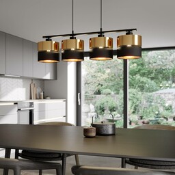 Lampa wisząca TK Lighting Hilton 4342 to propozycja dla osób poszukujących oświetlenia łączącego nowoczesną formę z wyrafinowaną estetyką. Wykonana z metalu i tkaniny, prezentuje się w kolorystyce czarno-złotej, która nadaje wnętrzu luksusowego charakteru. Cztery cylindryczne abażury rozmieszczone na poziomej listwie tworzą harmonijną kompozycję, doskonale wpisującą się w aranżacje salonów, jadalni czy sypialni utrzymanych w stylu glamour lub nowoczesnym.
