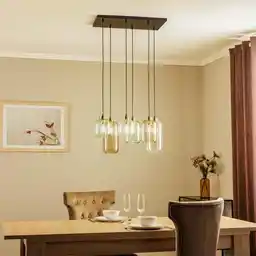 Lampa wisząca TK Lighting Marco 3325 to elegancka oprawa oświetleniowa, która łączy w sobie nowoczesny styl z funkcjonalnością. Jej konstrukcja opiera się na okrągłej, czarnej podsufitce o średnicy 37 cm, z której zwisają trzy szklane klosze w odcieniach transparentnego beżu, miodu i zieleni. Każdy klosz ma unikalny kształt i wysokość: 5 cm, 20 cm i 28 cm, co tworzy dynamiczny efekt świetlny w pomieszczeniu. Elementy metalowe wykończone są w kolorze złotym, co podkreśla elegancki charakter lampy.