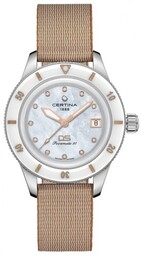 , Certina C036 207 18 106 00 to ekskluzywny, szwajcarski damski zegarek automatyczny z diamentami. Posiada perłową tarczę, białą kopertę ze stali szlachetnej i be... rozwiń